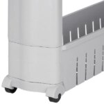 A 12,5 cm mély, gurulós szekrény négy tágas polcával tökéletesen kihasználja a bútorok közti üres réseket. Könnyen mozgatható, nedvességálló kialakítása miatt fürdőbe, konyhába és mosókonyhába is ideális.