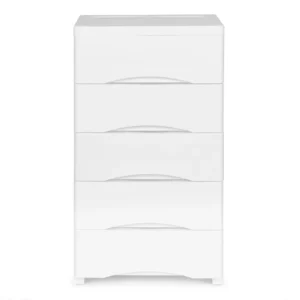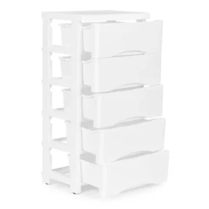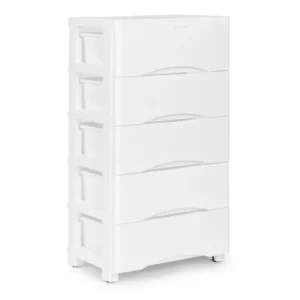 Ismerje meg a ModernHome márkájú műanyag polcot, amely tökéletes megoldást kínál a fürdőszobában vagy gyermekszobában való tárolásra. Az öt kényelmes fogantyúval ellátott fiók, a fiókok kiesését megakadályozó záróelemek és a könnyű mozgathatóságot biztosító görgős lábak mind hozzájárulnak a termék praktikumához és stabilitásához.