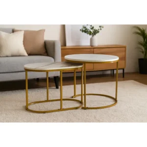 Két különböző méretű, márványhatású asztallap és arany fémváz ad rugalmas elrendezési lehetőséget, miközben elegáns fókuszpontot teremt a nappaliban. A helytakarékos kialakítás és a könnyen tisztítható felület hosszú távon is praktikus választássá teszi.
