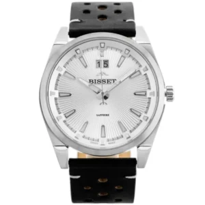 Bisset BSCF40 férfi karóra, zafírüveg, acél tok, fekete bőrszíj, WR50