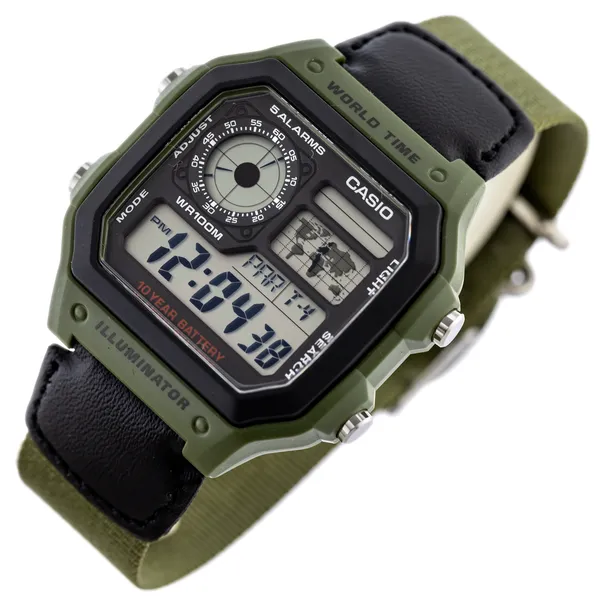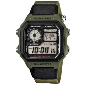 Casio AE-1200WHB-3B férfi digitális karóra zöld vászonszíjjal, WR100, 10 év elem