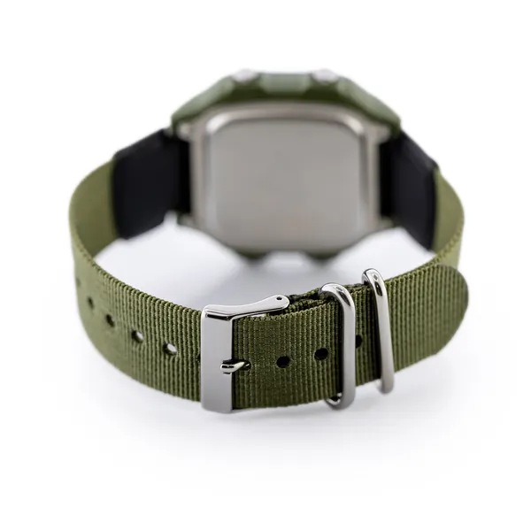 A 100 m-es vízállóságú, 10 évig működő elemű digitális karóra zöld vászonszíjával strapabíró társ a mindennapokra és sporthoz. LED megvilágítása, stopperje és automatikus naptára minden pillanatban gyors, pontos információt ad.