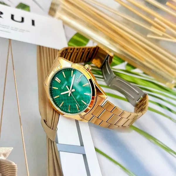 A Casio MTP-VD03G-3A férfi karóra a letisztult eleganciát ötvözi a mindennapi megbízhatósággal. Aranyszínű, 42 mm-es rozsdamentes acél tokja és karkötője hosszú távon is ellenáll a kopásnak, míg a zöld analóg számlap karakteres, mégis kifinomult megjelenést kínál. A precíz kvarc szerkezetnek és a diszkrét dátumkijelzésnek köszönhetően mindig pontos maradsz, az 50 m-es vízállóság pedig gondtalan viseletet biztosít az esőben vagy zuhanyzás közben is.