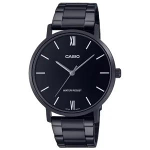A Casio MTP-VT01B-1B férfi karóra letisztult dizájnnal hódít: matt fekete, 40 mm-es rozsdamentes acél tok és hozzá illő szíj, jól olvasható analóg számlap fehér indexekkel. A csupán 8 mm vastag tok kényelmes viseletet biztosít ingujj alatt is, így a modell ideális az irodai hétköznapoktól a hétvégi programokig.