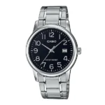 A Casio MTP-V002D-1BUDF azoknak a férfiaknak készült, akik szeretik a letisztult, időtálló formavilágot és a problémamentes működést. A japán kvarc szerkezet pontos időt ad, az analóg fekete számlap pedig nagy, kontrasztos indexeivel gyors leolvasást tesz lehetővé.