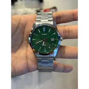 A Casio MTP-VD03D-3A1 férfi karóra tökéletes választás, ha letisztult eleganciára és megbízható időmérésre vágyik. A masszív, rozsdamentes acél tokozás és a zöld, analóg számlap időtlen megjelenést biztosít, míg a precíz kvarc szerkezet minden pillanatban pontosan mutatja az időt.