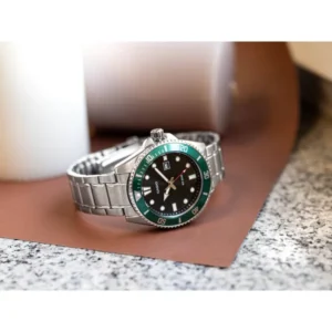 • Szín: fekete számlap, ezüst tok és szíj, zöld lünetta