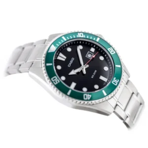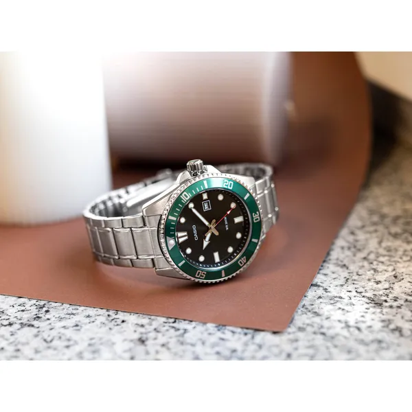 A Casio MDV-107D-3A sportos búváróra megbízható társ a mindennapokban és a víz alatti kalandok során. Masszív, 316L rozsdamentes acél tokja és szíja ellenáll az ütődéseknek, víznek és izzadtságnak, a karcálló ásványi üveg pedig hosszú távon megőrzi a fekete számlap tiszta láthatóságát. 200 m (20 ATM) vízállóságának köszönhetően bátran viselhető úszáshoz, snorkelezéshez vagy akár kezdő mélytengeri merülésekhez is.