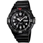 A Casio MRW-200H-1B férfi karóra a mindennapok ikonja: könnyű, fekete műanyag tokkal és szíjjal, sportosan elegáns megjelenéssel. A robusztus kialakítás a műanyag anyagnak köszönhetően strapabíró és kényelmes, így akár egész nap hordhatod.