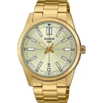 A Casio MTP-VD02G-9EUDF férfi karóra arany színű, rozsdamentes acél tokozása és szíja elegáns megjelenést kínál, miközben mindennapi tartósságot garantál. 41 mm-es, kerek számlapján jól olvasható fehér indexek és dátumkijelző segíti a gyors tájékozódást.