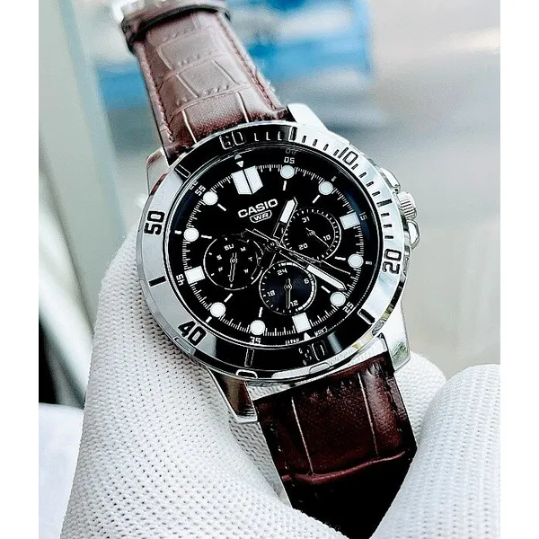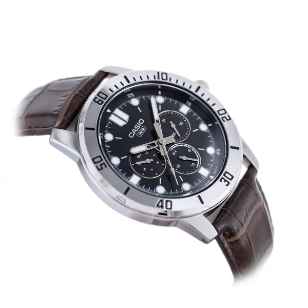 Casio MTP-VD300L-1E férfi kvarc karóra, 44 mm, barna bőr szíj, fekete számlap