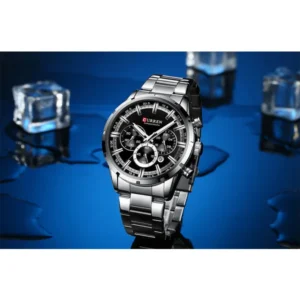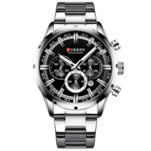 A Curren 8355 férfi kronográf karóra modern technológiát és letisztult, eredeti dizájnt ötvöz, így ideális választás mind üzleti, mind hétköznapi viselethez. A fekete számlapon ezüst indexek, dátumkijelző és 24-órás segédszámlap kapott helyet, a precíz kvarc szerkezet pedig megbízható időmérést biztosít.
