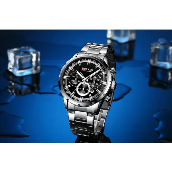 Curren 8355 férfi kronográf karóra, ezüst acél szíj, fekete számlap, WR30