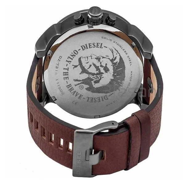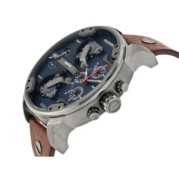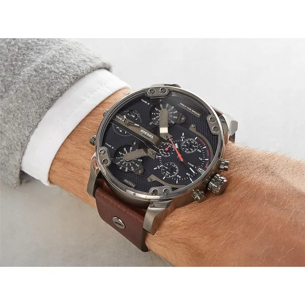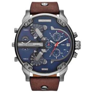 A Diesel DZ7314 férfi karóra gigantikus, 57 mm-es nemesacél tokkal és részletgazdag, többszintű számlappal készül, amely egyszerre négy független időzónát jelenít meg. A sötétkék számlap és a barna valódi bőrszíj kontrasztja kiemeli a modell karakterét, így hétköznapi viselethez és elegáns öltözethez is látványos kiegészítő.