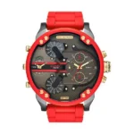 A Diesel Mr. Daddy 2.0 DZ7430 férfi karóra feltűnő 63×67 mm-es acél tokjával és merész, piros bevonatú rozsdamentes-acél szíjával azonnal a csukló fókuszpontja lesz. A 51 mm-es szürke számlapot arany és piros indexek díszítik, a tartós ásványüveg pedig védi a mechanizmust.