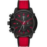 A Diesel Griffed kronográf 48 mm-es nemesacél tokkal, kényelmes piros-fekete szilikon szíjjal, karcálló ásványi üveggel és 5 ATM vízállósággal biztosítja a sportos eleganciát és a tartósságot. A stopperrel, dátumkijelzéssel és kontrasztos mutatókkal felszerelt kvarc szerkezet megbízhatóan követi tempós életstílusod minden helyzetben.