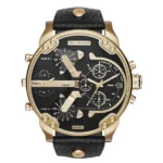 A Diesel Mr. Daddy 2.0 DZ7371 férfi karóra feltűnő, 57 mm-es aranyszínű nemesacél tokkal és fekete, valódi bőr szíjjal készül, így egyszerre sugároz prémium stílust és sportos karaktert. A fekete számlapot edzett ásványi üveg védi, amely ellenáll a karcoknak és ütődéseknek. A négy független, precíz kvarc-szerkezet akár négy időzónát is képes megjeleníteni, míg a kronográf és a dátumkijelzés tovább növeli a funkcionalitást. 3 ATM vízállósága elegendő a mindennapi használathoz, például kézmosáshoz vagy esőben való viseléshez.