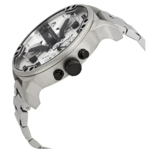Masszív, 57 mm-es, rozsdamentes acél Diesel karóra 4 független kvarc szerkezettel, chronograph-funkcióval és 30 m vízállósággal gondoskodik arról, hogy mindig pontosan, stílusosan érkezz; elegáns ajándékdobozban érkezik, így tökéletes meglepetés is. Kényelmes ezüst acél szíja hipoallergén bevonattal ideális egész napos viseletre, akár öltönyhöz, akár farmerhez.