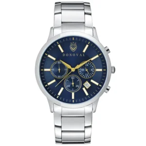 A Donoval Chronostar DL0024 férfi karóra elegáns kiegészítő, amely hétköznapi viselethez és ünnepi alkalmakhoz is tökéletes. A 43 mm-es, kerek, ezüstszínű tokozás és a masszív rozsdamentes-acél szíj tartósságot és allergiamentes komfortot kínál. A mélykék számlapot edzett ásványi üveg védi, a jól látható arany-fehér indexek pedig könnyű leolvashatóságot biztosítanak.