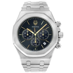 A Donoval Otto DL0015 karóra egy stílusos férfi időmérő – ideális mindennapi használatra, valamint különleges alkalmakra is. Az óraház rozsdamentes acélból készült, átmérője 41 mm, a karkötő szintén rozsdamentes acélból van. A fekete számlapot ásványi üveg védi, és tartalmazza a hónap napját, kronográf jelzéseket és arany színű órajelzőket. Az órát Miyota kvarc szerkezet hajtja.
