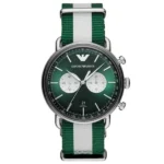 Az Emporio Armani AR11221 Aviator férfi karóra elegáns, mégis sportos megjelenést biztosít a mindennapokban és különleges alkalmakon egyaránt. A 44 mm-es, kerek nemesacél tok alatt precíz kvarc szerkezet működik, míg a zöld textilszíj könnyű és kényelmes viseletet nyújt. 50 m-es vízállóságának köszönhetően esőben vagy kézmosáskor sem kell levenned.