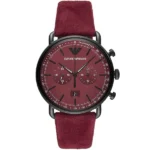 Elegáns, bordó kronográf karóra fekete PVD-tokkal és bőr-szövet szíjjal: pontos kvarc szerkezet, WR50 vízállóság és ajándékozásra kész Armani díszdoboz.