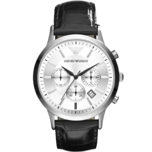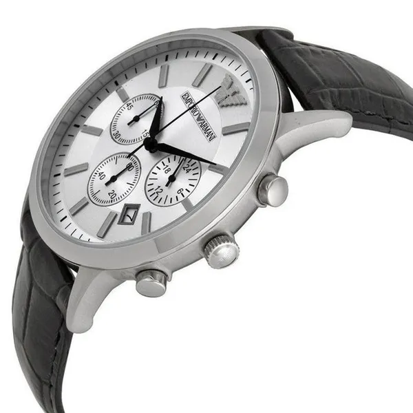 Az Emporio Armani Renato AR2432 férfi karóra letisztult, időtálló megjelenést kínál mindennapi és alkalmi viselethez egyaránt. A 43 mm-es, nemesacél tokhoz kényelmes fekete, valódi bőr szíj társul, a szemet gyönyörködtető ezüst számlapot pedig karcálló mineralüveg védi. A pontos kvarc szerkezet három segédszámlapon mér időt: kronográf, 24 órás kijelzés és napkijelzés segíti a hétköznapokat. 5 bar (WR50) vízállóságának köszönhetően a karóra a kisebb fröccsenéseknek is ellenáll.