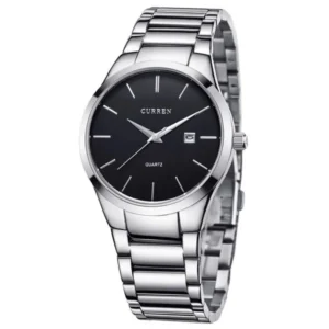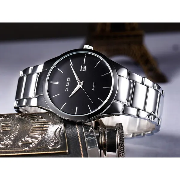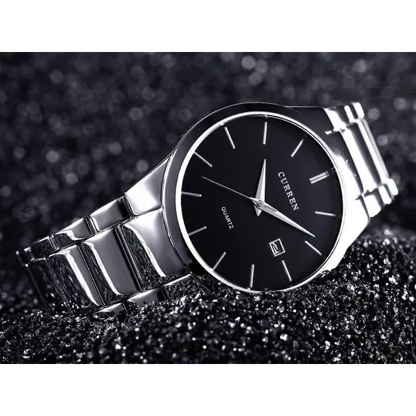 Férfi karóra Curren 8106, ezüst rozsdamentes fém szíj, fekete számlap, WR30