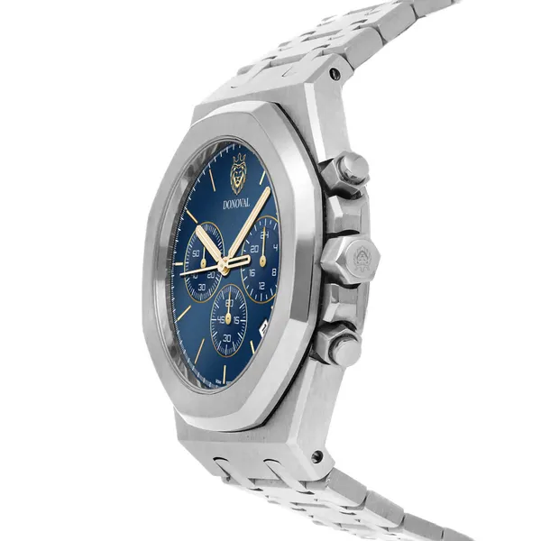 Stílusos férfi kronográf karóra, amely a mindennapokhoz és elegáns alkalmakhoz is illik. 41 mm-es, rozsdamentes acél tokja és fémszíja tartós, a kék számlapot karcálló ásványi üveg védi. A megbízható Miyota kvarc szerkezet pontos időmérést garantál, míg a kronográf funkció és a dátumkijelző extra praktikumot nyújt.