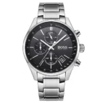 Elegáns, rozsdamentes acél Hugo Boss kronográf karóra fekete számlappal és dátumkijelzéssel, amely öltönyhöz és casual viselethez is kifinomult megjelenést biztosít.