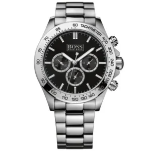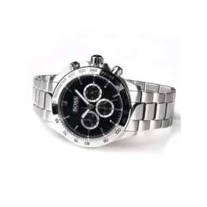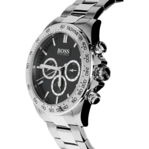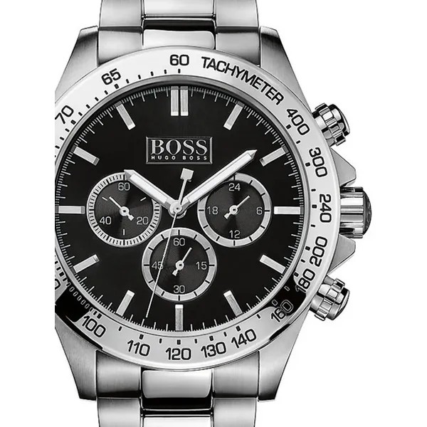 A Hugo Boss Ikon férfi karóra letisztult, rozsdamentes acél tokjával és fémszíjával kifinomult megjelenést kínál. A fekete számlapon található kronográf és tachiméter a sportos mérési lehetőségekről gondoskodik, míg a megbízható kvarc szerkezet mindig pontos időt biztosít.