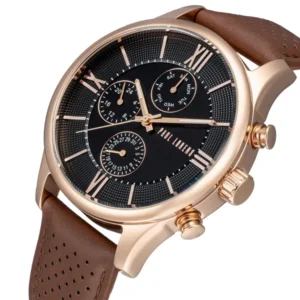 Japán Miyota szerkezetű férfi karóra rózsaarany tokkal, fekete számlappal és puha bőrszíjjal, amely elegáns megjelenést és precíz időmérést kínál. WR30 vízállósága, dátumkijelzője, antiszalergén bevonata és ajándék díszdoboza révén stílusos, tartós és praktikus választás a mindennapokra vagy különleges alkalmakra egyaránt, igényes viselőinek.