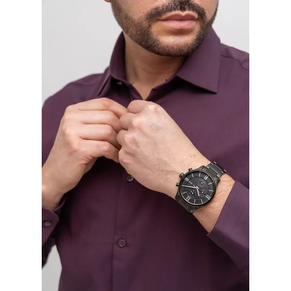 Egyedi fekete dizájnjával, 45 mm-es tokjával és japán SEIKO EPSON szerkezetével ez a karóra megbízható pontosságot, letisztult eleganciát és magabiztos megjelenést ad mindennapjaidhoz. A hipoallergén, IPB bevonatú nemesacél szíj, a dátum- és 24-órás kijelzés, valamint a díszdoboz révén kiváló ajándék, amely irodai viselethez és hétvégi szettekhez egyaránt illik.