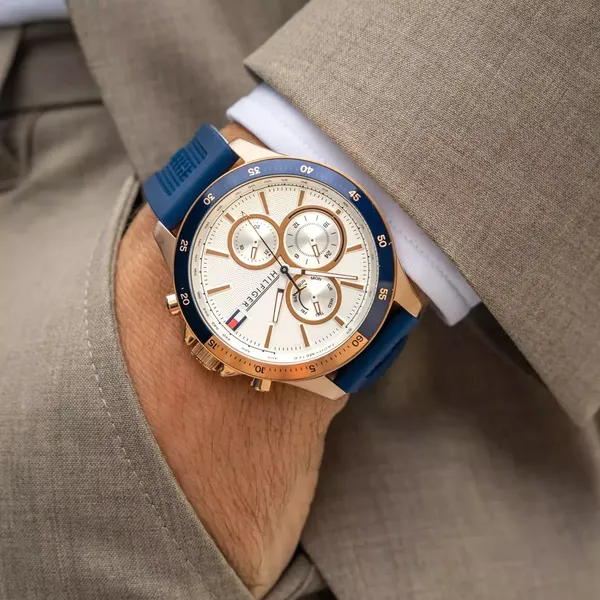 Tommy Hilfiger Bank 1791778 férfi karóra a sportosan elegáns megjelenést ötvözi a mindennapi kényelemmel. Rozéarany színű, 46 mm átmérőjű nemesacél tokja ellenálló a korrózióval szemben, a fehér számlapot ásványüveg védi a karcolásoktól. A puha, kék szilikon szíj tökéletesen igazodik a csuklóhoz, így hosszabb viselés közben sem válik kényelmetlenné.