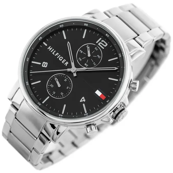 Legyen szó irodai megjelenésről vagy hétvégi programról, a Tommy Hilfiger Daniel 1710413 férfi karóra megbízható társ a mindennapokban. A pontos kvarc szerkezetet ezüstszínű, rozsdamentes acél tok óvja, amelyhez harmonizáló, 22 mm széles acél szíj társul. A 44 mm-es, kerek ház alatt fekete számlap rejtőzik, domború ezüst indexekkel és mutatókkal, így a leolvasás mindig pillanatok műve.