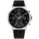 A Tommy Hilfiger Daniel 1710381 férfi karóra a letisztult amerikai stílust kombinálja modern praktikumokkal. A 46 mm-es, ezüstszínű, rozsdamentes acél tokot fekete, valódi bőrszíj öleli körbe, amely kényelmes viselést és tartósságot garantál. A fekete számlapot karcálló, 5/10 Mohs-keménységű ásványi üveg védi, így bátran viselheted a mozgalmas hétköznapok során.