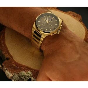 Az aranyszínű 316L nemesacél tok és branszóleta kifinomult ragyogást kölcsönöz, miközben a barna napsugár-csiszolt számlap és a multifunkciós segédszámlapok praktikus nap-, dátum- és 24 órás kijelzést biztosítanak. WR50 vízállóságával és mineralüvegével tartós, megbízható társ a mindennapokban.