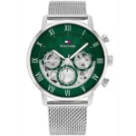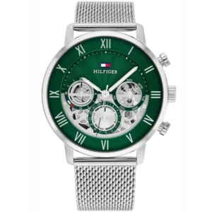 Szereted, ha a kiegészítőd egyszerre elegáns és funkcionális? A Tommy Hilfiger Legend férfi karórát 316L rozsdamentes acélból készült 44 mm-es tok és bransóleta teszi tartóssá, hipoallergénné és fényesen ezüstszínűvé. A napsugaras csiszolású, zöld open-heart számlap betekintést enged a precíz kvarc szerkezetbe, miközben külön segédszámlapokon mutatja a dátumot, a hét napját és a 24 órás időformátumot. 5 ATM vízállósága megóvja a mindennapi fröccsenésektől, a karcálló ásványi üveg pedig védi a számlapot.