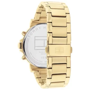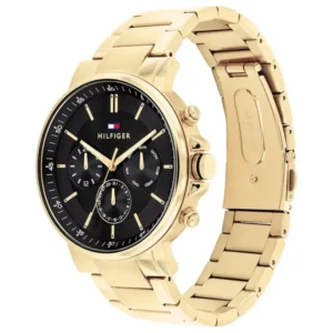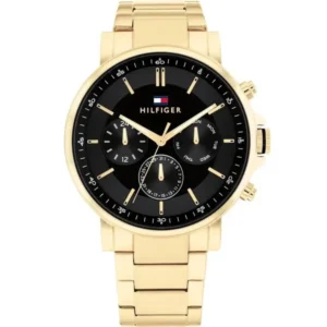 A Tommy Hilfiger Tyson 1710589 elegáns férfi karóra, amely a fekete napfénymintás számlapot ötvözi a fényes aranyszínű rozsdamentes acél tokkal és szíjjal. A 44 mm-es, hipoallergén 316L acélból készült tok stílusos megjelenést és tartósságot kínál, míg a megbízható kvarc szerkezet pontos időmérést biztosít. A számlapon három segédmutató kapott helyet: dátum (nap és hét napja), valamint 24 órás kijelzés, amelyet karcálló ásványi üveg véd.