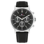 A Tommy Hilfiger Tyson férfi karóra a fekete bőrszíj és az ezüst 316L acél tok időtlen kombinációját kínálja. A 44 mm-es tokot karcálló ásványi üveg fedi, a napsugár-csiszolt fekete számlap pedig finom ezüst indexekkel és három segédszámlappal díszített, amelyek a dátumot, a hét napját és a 24 órás időt mutatják. A megbízható kvarc szerkezet hosszú élettartamú elemmel működik, az 5 ATM vízállóság pedig védi az órát a fröccsenések és az eső ellen.