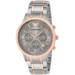 Męski zegarek Emporio Armani Renato AR11077 to klasyczny męski zegarek, idealny zarówno do eleganckiego ubioru, jak i do noszenia na co dzień. Koperta oraz bransoleta zostały wykonana ze stali szlachetnej, co gwarantuje jej wieloletnią odporność na zniszczenie. Na srebrnej tarczy zabezpieczonej mineralnym szkłem znajdziemy wyznaczniki godzin w kolorze różowego złota, datownik wskazujący dzień miesiąca oraz subtarcze będące wskazaniami chronografu.
