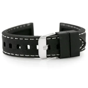 A 18 mm széles, rugalmas gumiszíj fekete alapon fehér varrással modern, sportos megjelenést biztosít és kényelmes viseletet nyújt a mindennapokban.
