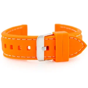 A víz- és izzadságálló narancssárga gumiszíj fehér varrással 7 furattal 136–180 mm közötti csuklóra szabható. Sportos megjelenést, könnyű tisztíthatóságot és egész napos kényelmet kínál.