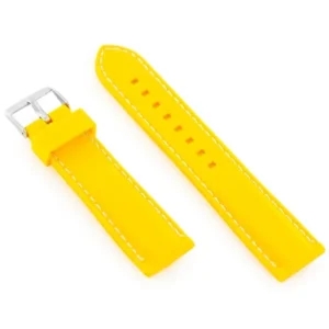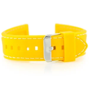 A sárga, fehér varrással ellátott gumiszíj élénk megjelenést és kényelmes viseletet kínál a mindennapokra, legyen szó sportos tevékenységről vagy hétköznapi használatról. A rugalmas, víz- és izzadságálló anyag hosszú élettartamot biztosít, míg a fényes, ezüstszínű fémcsat megbízható rögzítést nyújt.