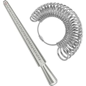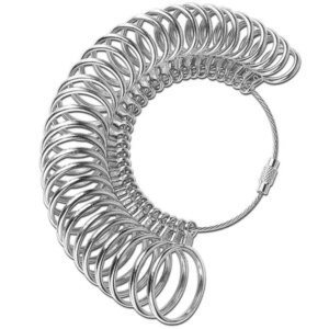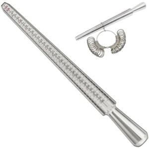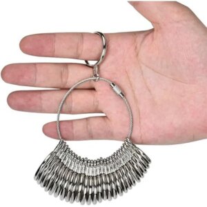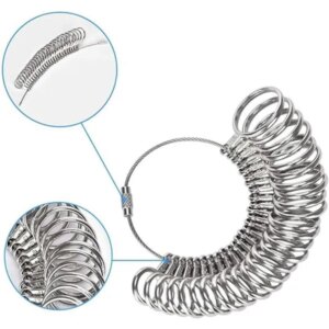 Acél ékszerész mérőeszköz, amely megkönnyíti a gyűrű és karikagyűrű méretének meghatározását. Rendkívül hasznos eszköz otthoni használatra is. Minden ékszerész és aranyműves nélkülözhetetlen kelléke. A készlet lehetővé teszi az ujjméret gyors ellenőrzését számozott gyűrűkészlet segítségével. Különleges tüskével az ujj átmérőjének mérésére.
