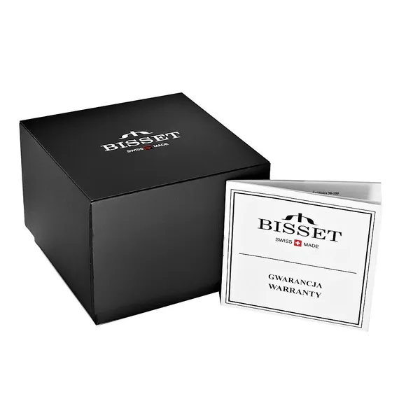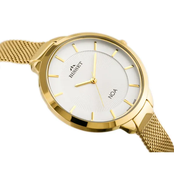 A Bisset női karórája elegáns megjelenést és megbízható működést kínál, köszönhetően a Svájcban készült Ronda kvarc szerkezetnek. Az aranyszínű, PVD bevonatú nemesacél tok és karkötő harmonikus kontrasztot alkot a csillogó ezüst számlappal, így a modell bármely öltözéket finoman emeli ki.