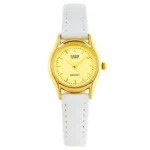 Az elegáns Casio LTP-1094Q-9ARDF női karóra diszkrét 24 mm-es aranyszínű acéltokjával és fehér valódi bőrszíjával könnyedén illik hétköznapi és alkalmi viselethez is. A kvarc szerkezetnek köszönhetően pontos időmérést biztosít, míg a karcálló mineralüveg óvja a csillogó arany számlapot.
