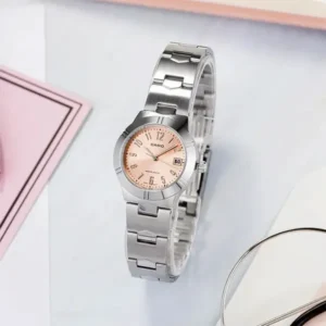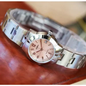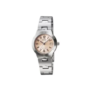 A Casio LTP-1241D-4A3 női karóra a visszafogott elegancia és a mindennapi megbízhatóság tökéletes párosítása. A 25 mm-es, ezüstszínű rozsdamentes acél tokot karcálló ásványi üveg védi, míg a finom rózsaszín számlap ezüst indexekkel és dátumablakkal teszi átláthatóvá az idő leolvasását.