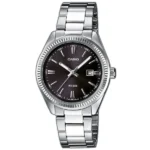 A Casio LTP-1302D 1A1 női karóra minimalista eleganciát és mindennapi praktikusságot kínál. A polírozott, rozsdamentes acél tok és szíj diszkrét fényével tökéletesen harmonizál a mélyfekete számlappal, amelyet finom dátumablak egészít ki.