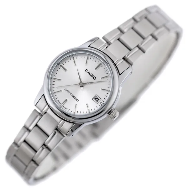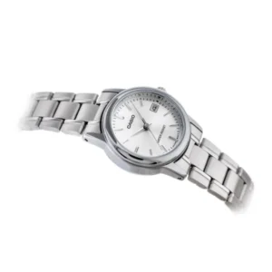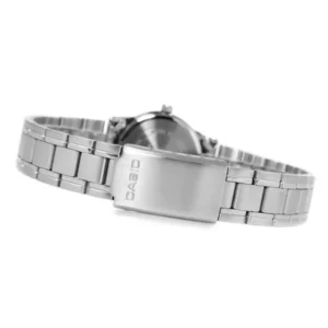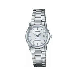 A Casio LTP-V002D-7AUDF női karóra letisztult, időtlen megjelenést kínál: kompakt, 25 mm-es rozsdamentes acél tokja és finoman csillogó ezüst számlapja bármilyen öltözékhez illik.
